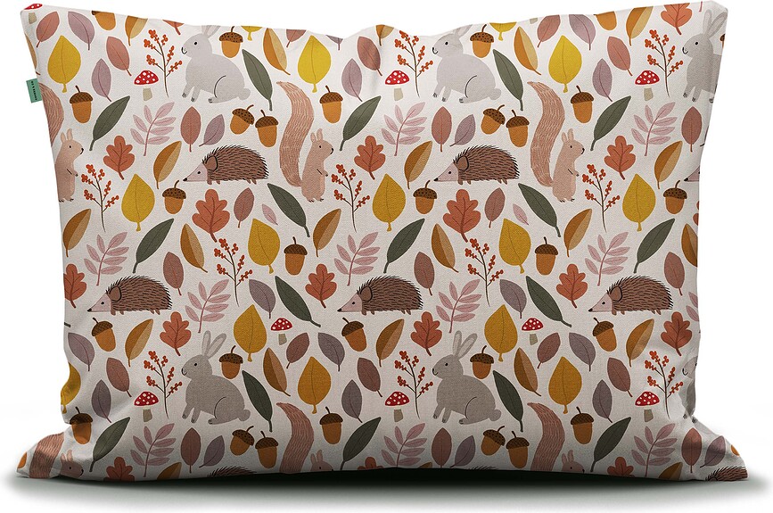 Παιδικά βαμβακερά κλινοσκεπάσματα διακοσμημένα με μοτίβα δάσους: φύλλα, σκαντζόχοιρους, λαγούς, βελανίδια... Από την άλλη πλευρά, τα κλινοσκεπάσματα For Rest έχουν ριγέ σχέδιο. Κάθε σετ περιλαμβάνει μία μαξιλαροθήκη.
