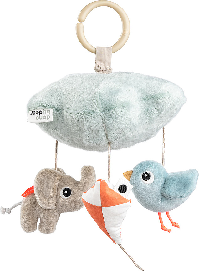 - Τα κινούμενα στοιχεία με τη μορφή φιλικών ζώων και ενός χαρταετού τραβούν την προσοχή του μωρού, τονώνοντας την οπτική του ανάπτυξη και την περιέργειά του για τον κόσμο.