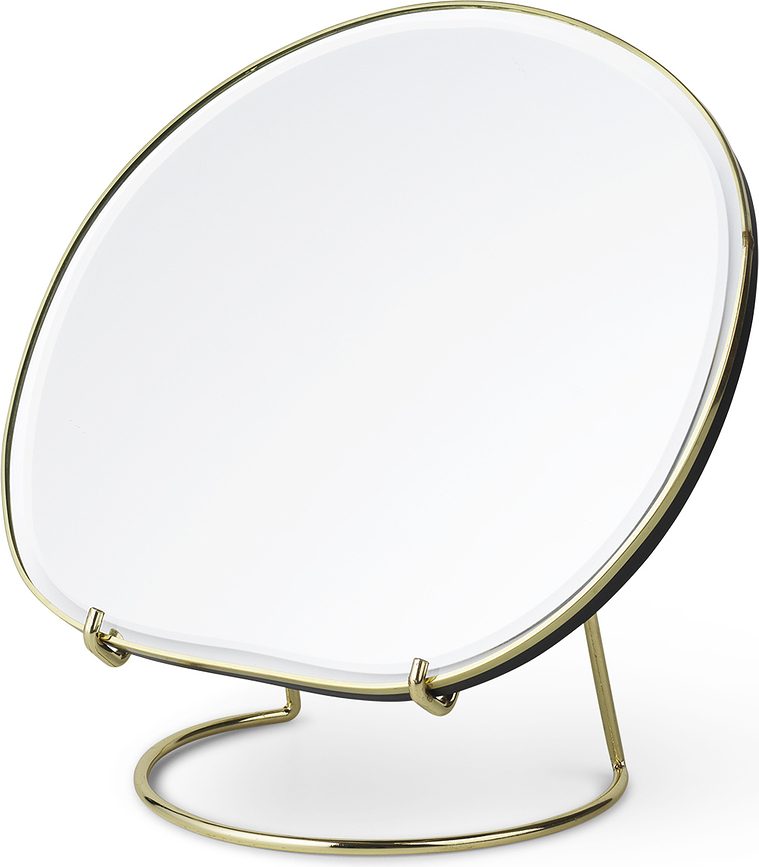 Ο καθρέφτης καλλυντικών Pond από την Ferm Living αποτελείται από δύο μέρη: τον ίδιο τον καθρέφτη σε ορειχάλκινο ή χρωμιωμένο πλαίσιο και μια πρακτική βάση που μπορεί να τοποθετηθεί σε τραπέζι ή τουαλέτα.