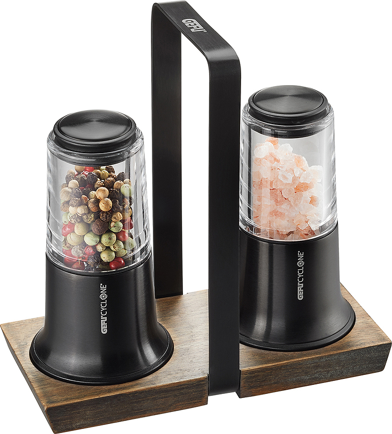 Το τριμερές σετ X-Plosion της Gefu, το οποίο περιλαμβάνει μύλους αλατιού και πιπεριού με βάση, θα φανεί χρήσιμο τόσο στο σπίτι όσο και σε εστιατόρια. Είναι απίστευτα κομψό και πολύ βολικό στη χρήση. Η φινέτσα του ενισχύεται από τα στοιχεία ξύλου και ανοξείδωτου ατσαλιού.