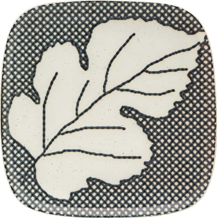 Η τετράγωνη πιατέλα με φυτικό μοτίβο αποπνέει έναν ρετρό αέρα που μαγνητίζει. Η ματ επιφάνεια, το εκφραστικό γραφικό σχέδιο και οι γκρι-λευκοί τόνοι δημιουργούν ένα πρωτότυπο σύνολο που θα κλέψει τις εντυπώσεις! Η πιατέλα είναι κατασκευασμένη από πέτρινο κεραμικό και πλένεται στο πλυντήριο πιάτων. Μπορεί επίσης να χρησιμοποιηθεί στο φούρνο μικροκυμάτων.