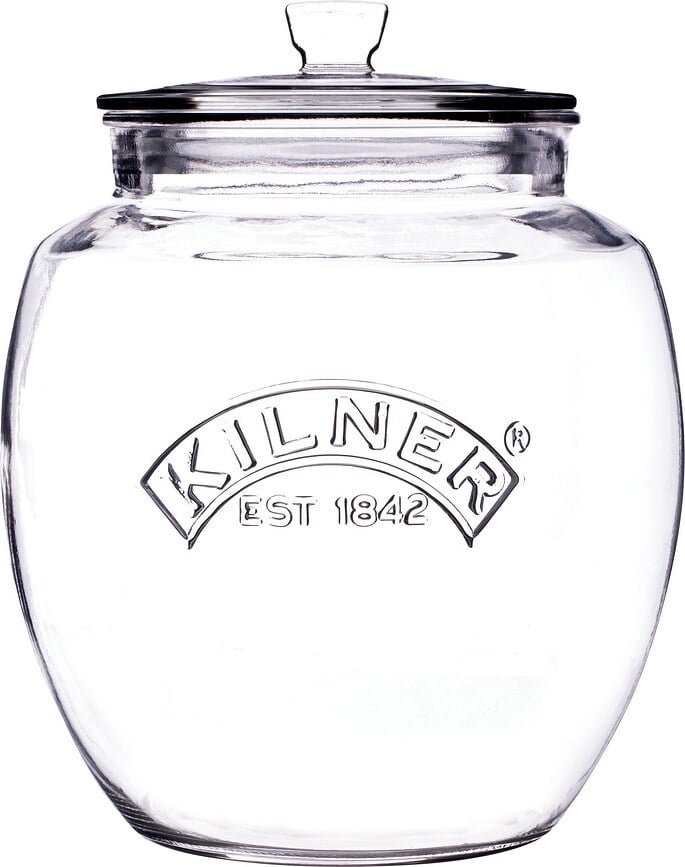 Το δοχείο κουζίνας Kilner σε μορφή γυάλινου βάζου είναι ένα προϊόν με παραδοσιακό και πρακτικό χαρακτήρα. Το ανάγλυφο δοχείο με καπάκι που κοσμείται από στρογγυλή λαβή θα ταιριάξει σε κάθε κουζίνα και θα επιτρέψει την υγιεινή και αισθητικά ευχάριστη αποθήκευση διαφόρων ξηρών προϊόντων. Καφές, ζάχαρη, ζυμαρικά ή δημητριακά θα παραμείνουν στεγνά, ενώ πολύχρωμα γλυκά θα αναδειχθούν κομψά. Τα διαφανή τοιχώματα θα φανούν επίσης χρήσιμα αν αποφασίσετε να χρησιμοποιήσετε το βάζο Kilner που παρουσιάζεται εδώ ως δοχείο για τη δημιουργία διακοσμήσεων – από κοχύλια, κάστανα κ.λπ. ή ως δοχείο για βαμβάκια ή άλλα καλλυντικά είδη. Το ανάγλυφο λογότυπο του κατασκευαστή προσδίδει στα μνημεία μια ρετρό πινελιά. Υ.Γ.: Για σπιτικά γλυκά, είναι ό,τι πρέπει! Σημείωση: Μην ρίχνετε βραστό νερό στο βάζο.
