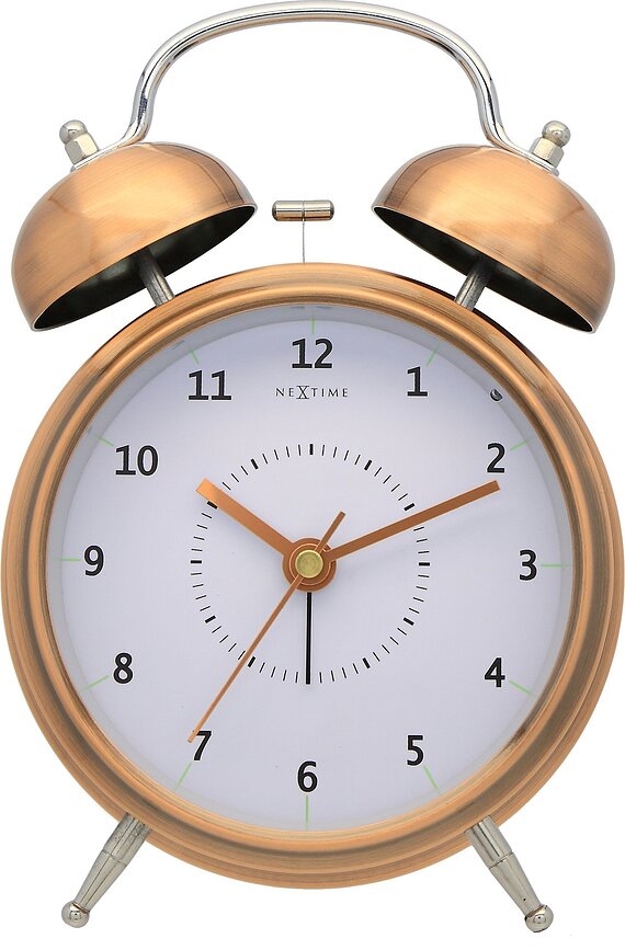 Ένα κλασικό σχήμα και ένα κομψό χρωματικό φινίρισμα είναι τα χαρακτηριστικά του ξυπνητηριού Wake Up που παρουσιάζεται εδώ. Με μια όμορφη χάλκινη κάσα, το ξυπνητήρι αποπνέει μια διαχρονική vintage αίσθηση χάρη στα δύο παραδοσιακά κουδουνάκια που στεφανώνουν την κάσα και τα διακριτικά ποδαράκια που εξέχουν. Το λευκό καντράν αναδεικνύει υπέροχα τους χάλκινους δείκτες και αποτελεί το τέλειο φόντο για τον μαύρο δείκτη και τους αραβικούς αριθμούς που σηματοδοτούν τις ώρες. Εκτός από τη λειτουργία αφύπνισης, το ξυπνητήρι είναι εξοπλισμένο με λειτουργία οπίσθιου φωτισμού και αθόρυβο μηχανισμό.