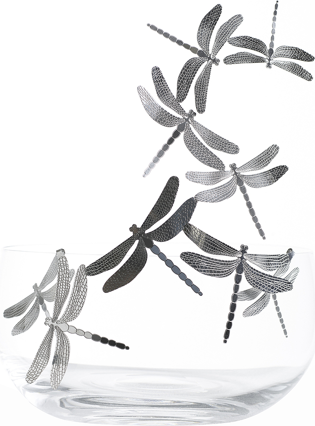 • Διακοσμητικές μπρούτζινες λιβελούλες προεξέχουν από το χείλος του μπολ και τραβούν αμέσως την προσοχή.