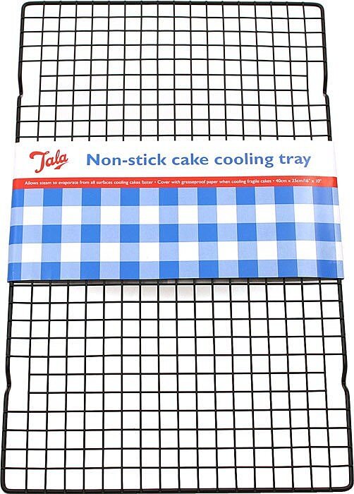 Η μεταλλική σχάρα ψύξης κέικ της Tala είναι ένα κλασικό αξεσουάρ που θα σας επιτρέψει να ψύξετε τα σπιτικά σας κέικ στις σωστές συνθήκες. Η μεταλλική σχάρα διαθέτει διπλή αντικολλητική επίστρωση και, χάρη στα πόδια που κρατούν τη σχάρα πάνω από τον πάγκο εργασίας, εξασφαλίζεται επαρκής κυκλοφορία αέρα για να αποτραπεί η παραμονή υγρασίας κάτω από την ψημένη κρούστα.